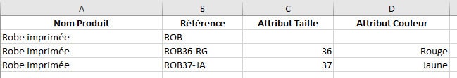 2 : les références sont ajoutées aux déclinaisons, la référence du produit parent sera identique à sa première déclinaison et la lettre P [REF01 - REF01P]