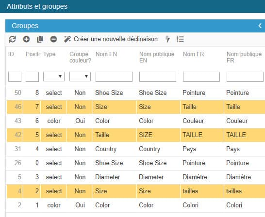 Il arrive fréquemment que plusieurs groupes d'attributs de déclinaisons existent en double ou en triple, avec des intitulés légèrement différents, comme par exemple Taille, tailles, TAILLE - visibles dans la fenêtre des Attributs & Groupes du menu Catalogue.