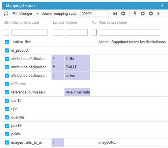 Votre fichier affichera 1 ligne par déclinaison, avec les 3 colonnes des 3 groupes Taille, TAILLE, tailles.