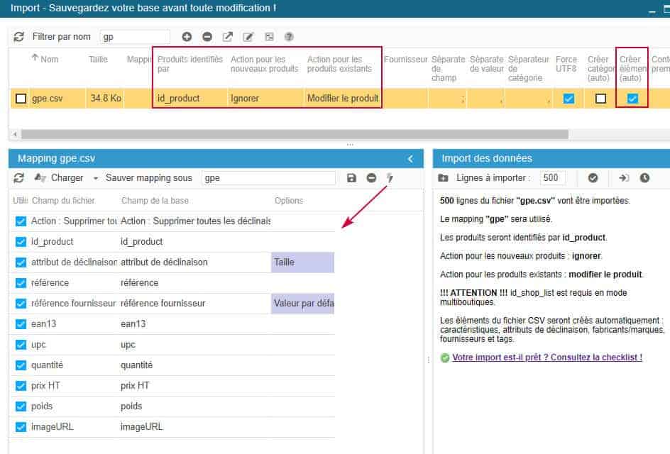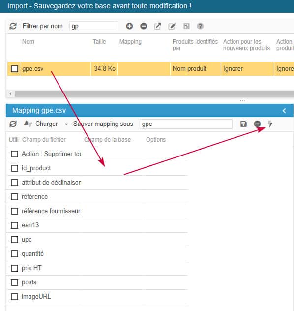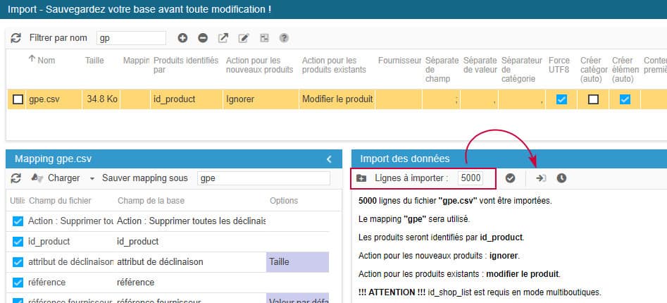 Sélectionnez les options dans le panneau principal : id_product + ignorer + modifier