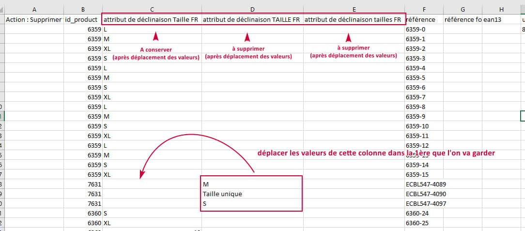 Tous les attributs qui se trouvent dans les colonnes tailles et TAILLES doivent être glissés dans la colonne Taille que nous gardons.