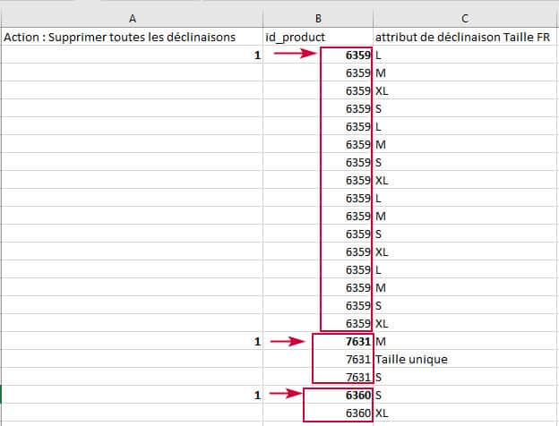 Ensuite, dans la toute première colonne 'Action : Supprimer toutes les déclinaisons', il faut indiquer 1 sur toutes les lignes d'un nouvel id_product, comme ceci :