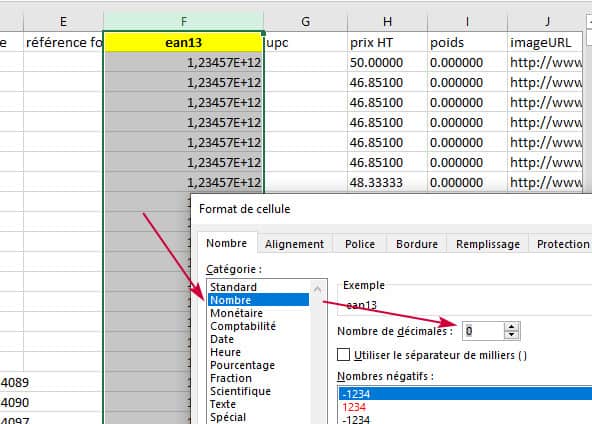 Si vous avez des codes ean13 dans votre fichier, appliquez le format 'nombre + 0 décimales' pour que les codes soient correctement affichés.