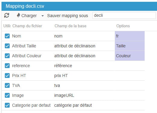 Chaque ligne représente une déclinaison. Toutes les informations de cette ligne, comme le montre l'exemple ci-dessous, seront associés à la déclinaison de la ligne.