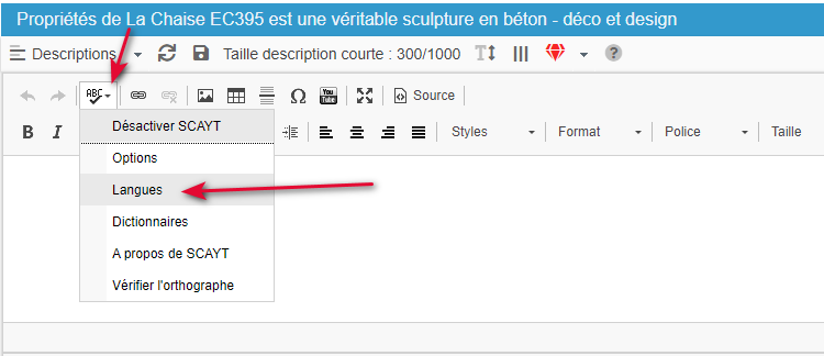 Vous pouvez choisir la langue de l'éditeur de texte utilisée dans le panneau des descriptions qui se trouve dans la colonne des propriété à droite.