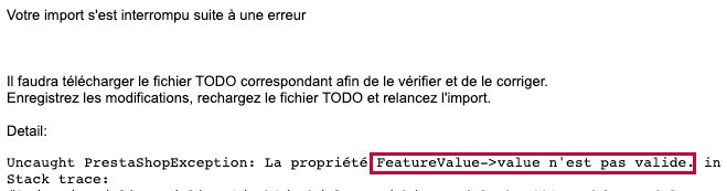 Téléchargez le fichier TODO correspondant pour vérifier le produit qui utilise cette valeur de caractéristique, pour ensuite corriger le problème dans Store Commander.