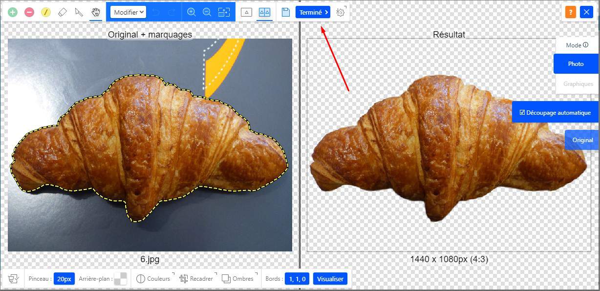 L'image est ensuite sur votre produit (1), et vous pouvez vous servir de notre outil de détourage pour corriger le fond (2).