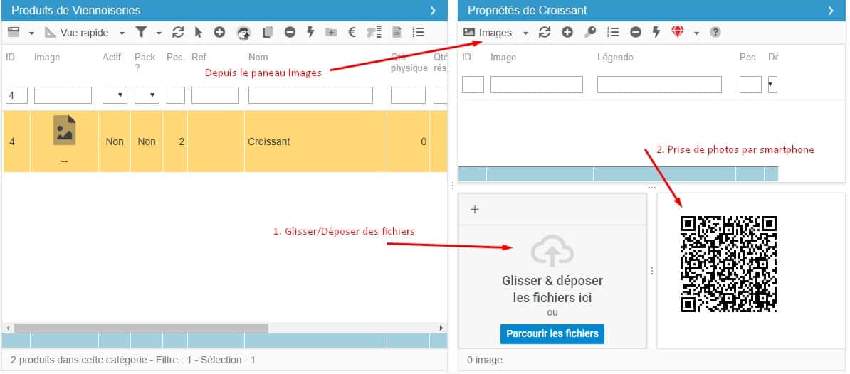 > En "cliquant" sur "Ajouter les images" : celles-ci sont envoyées directement sur la fiche produit. La tâche fastidieuse de faire transiter les fichiers n'existe plus.