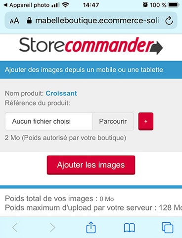 > En "cliquant" sur "Parcourir" puis "Prendre une photo", vous placez la photo dans cet outil, prête à être envoyée sur votre boutique.
