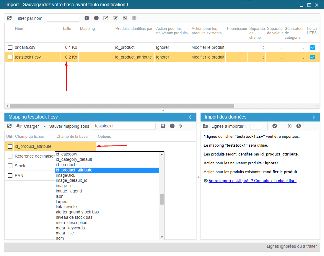 J'identifie donc mes déclinaisons par id_product_attribute et mes actions seront sur "Ignorer + modifier".