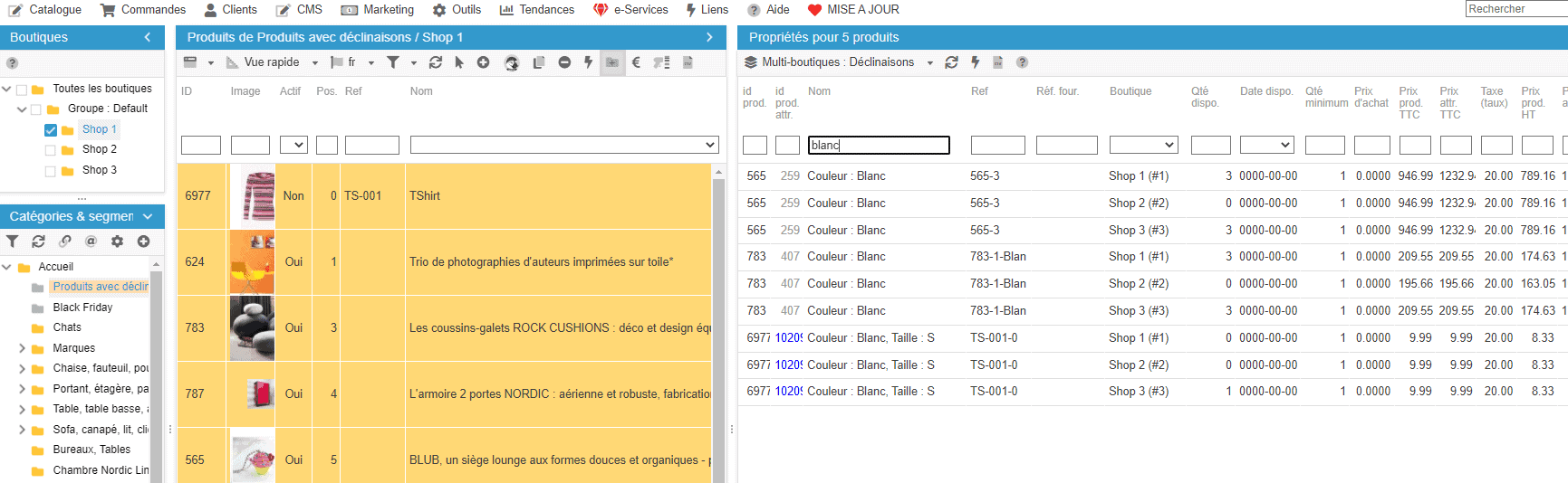 Sur la capture ci-dessous, on affiche les déclinaisons de plusieurs produits afin de modifier les prix des déclinaisons 'Blanc' (que je filtre dans la colonne 'nom de la déclinaison') sur toutes les boutiques.