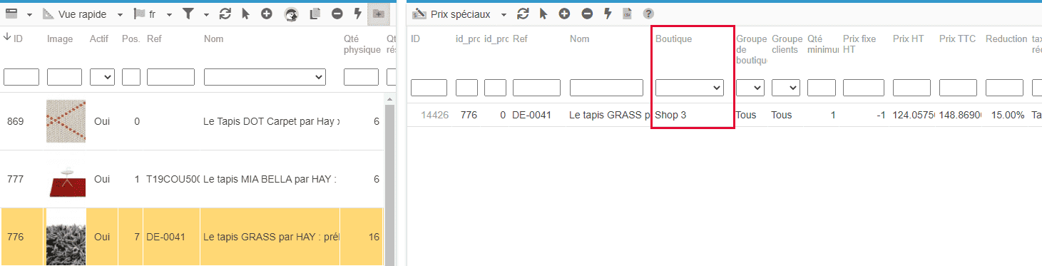 La grille des prix spéciaux affiche une colonne 'boutique' qui vous permet d'identifier sur quelle boutique la promotion est appliquée.