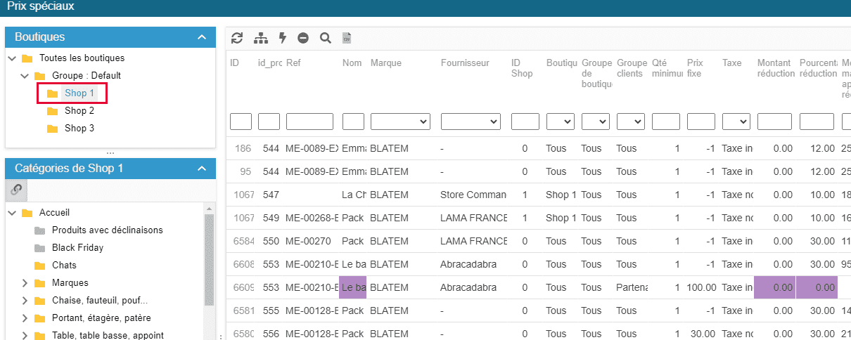 Vous aurez ainsi la liste de tous les prix spéciaux existants sur une boutique en particulier que vous sélectionnez dans l'arbre à boutiques.