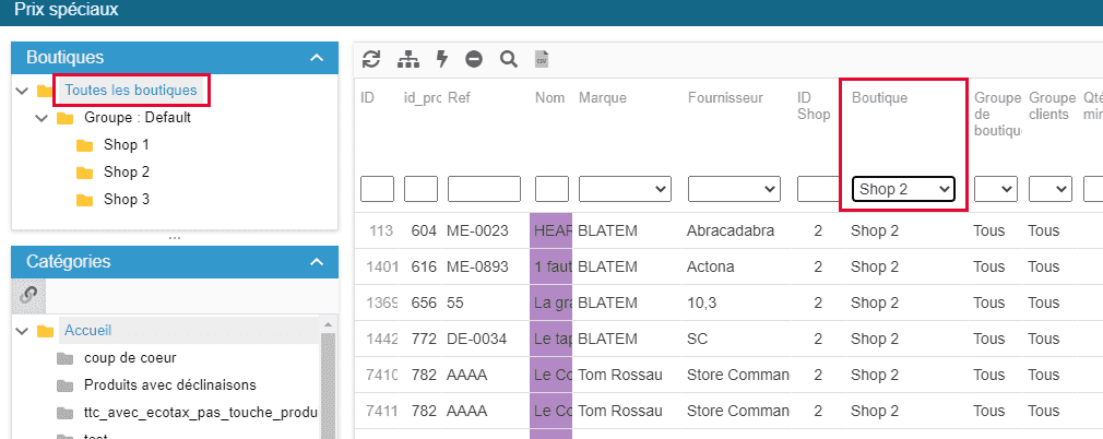 Il est possible de sélectionner plusieurs produits afin d'afficher tous les prix spéciaux associés, pour ensuite filtrer par boutique, pour voir quels sont les prix spéciaux spécifiques à une boutique.