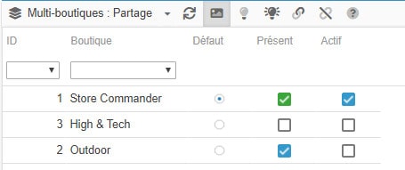 Les produits peuvent être disponibles dans différentes boutiques, et cette notion de partage peut être effecutée dans la grille Multiboutiques Partage de la colonne des Propriétés de Sc.
