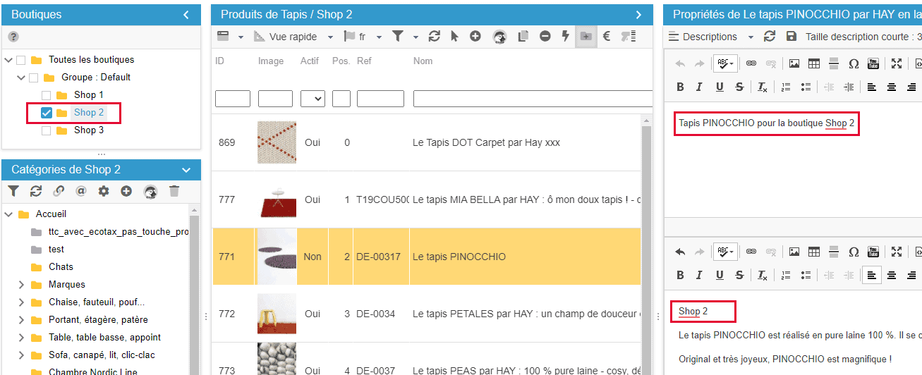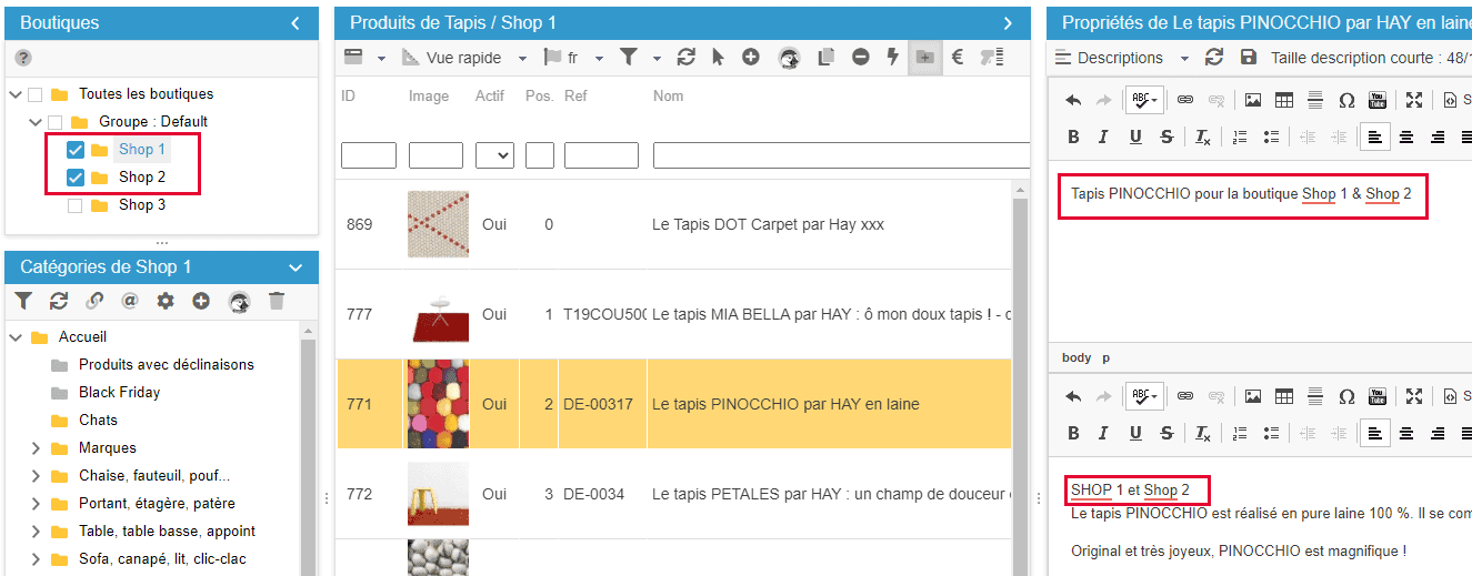 Lorsqu'un produit existe dans plusieurs boutiques, vous avez la possibilité de définir une description spécifique sur chaque boutique, ou bien commune à plusieurs boutiques.