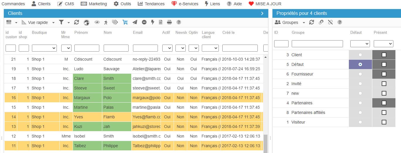 Pour associer des clients à des groupes clients spécifiques, utilisez la fenêtre 'Groupes' dans la colonne des propriétés de l'interface Clients.