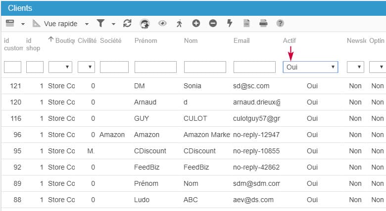 Pour exporter la liste complète de tous vos client actifs, utilisez le filtre 'Actif' en sélectionnant 'oui'