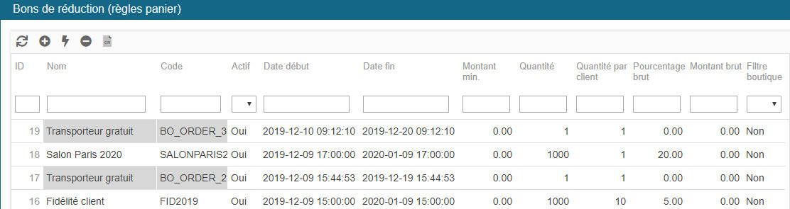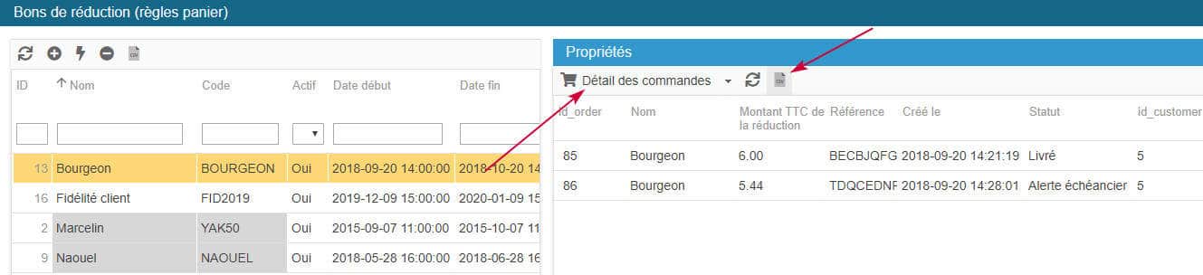 L'interface de Store Commander contient une fenêtre dans laquelle vous pouvez gérer les bons de réduction, accessible depuis le menu Commandes > Bons de réduction (règles panier), notamment afficher et extraire la liste des commandes, information clients compris, qui ont bénéficier d'un bon de réduction spécifique.