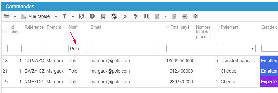 Depuis la vue Rapide par exemple, utilisez le filtre de la colonne Nom pour y saisir le nom du client en question. Les commandes associées seront automatiquement affichées.