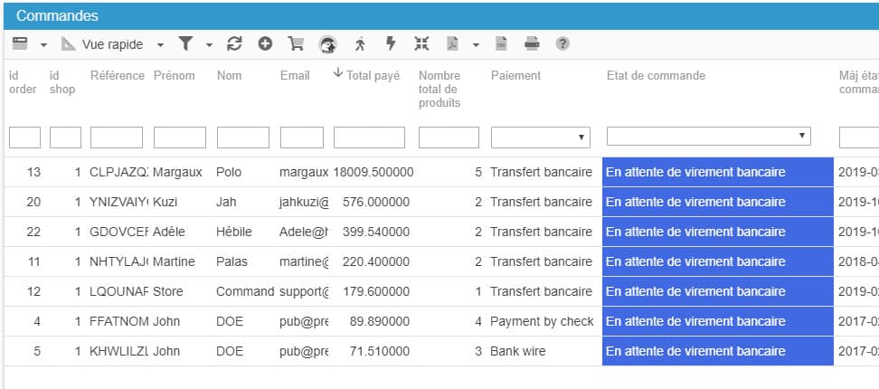 Si vous souhaitez visualiser toutes les commandes en attente de paiement par virement par exemple, cochez les cases correspondantes dans les filtres et seules les commandes concernées seront affichées.