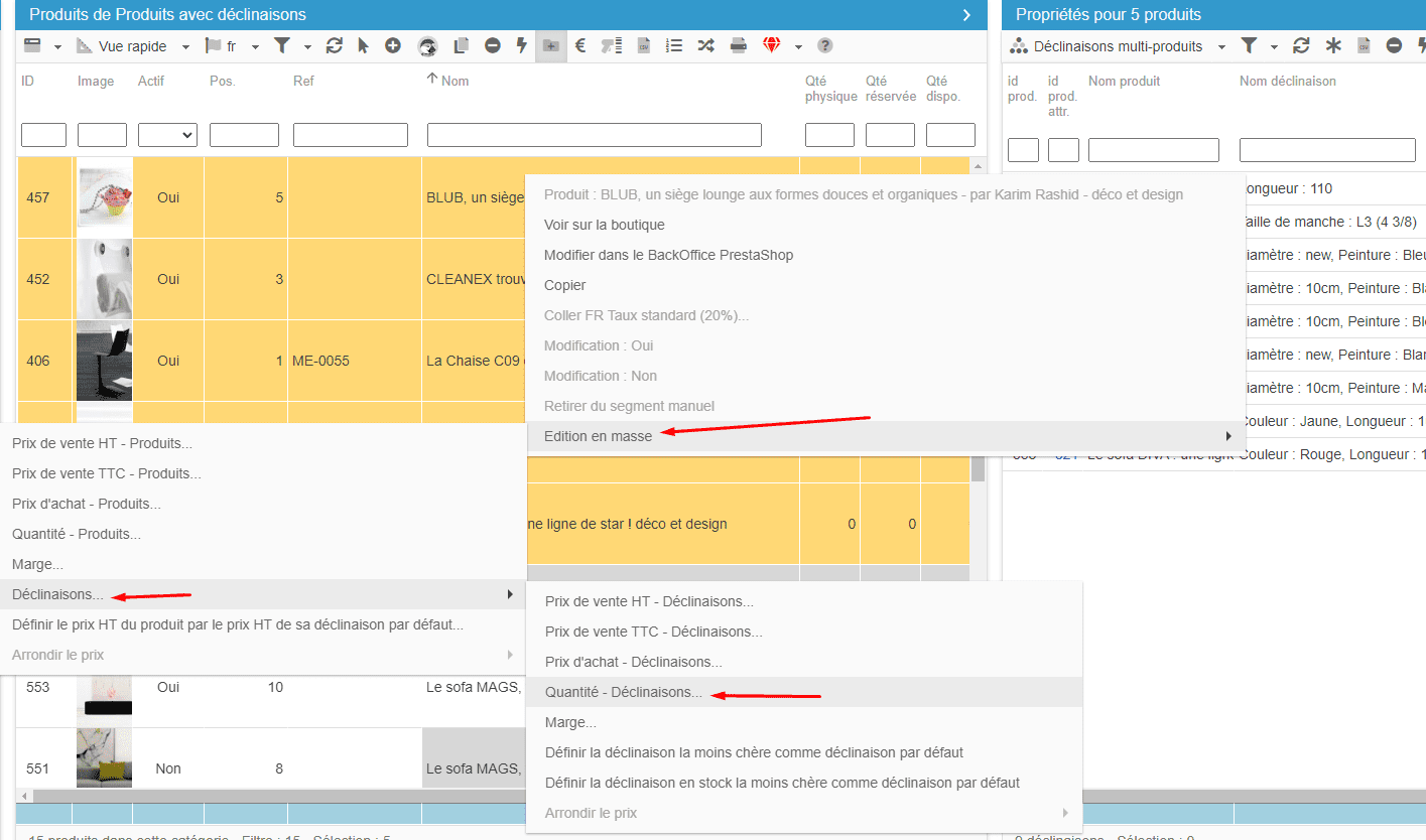 2- Faites un clic droit sur les produits concernés > Edition en masse > Déclinaisons > Quantité - déclinaisons.