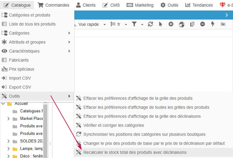 Pour résoudre ce problème d'affichage, lancez l'option sous Catalogue > Outils > Recalculer le stock total des produits avec déclinaisons :