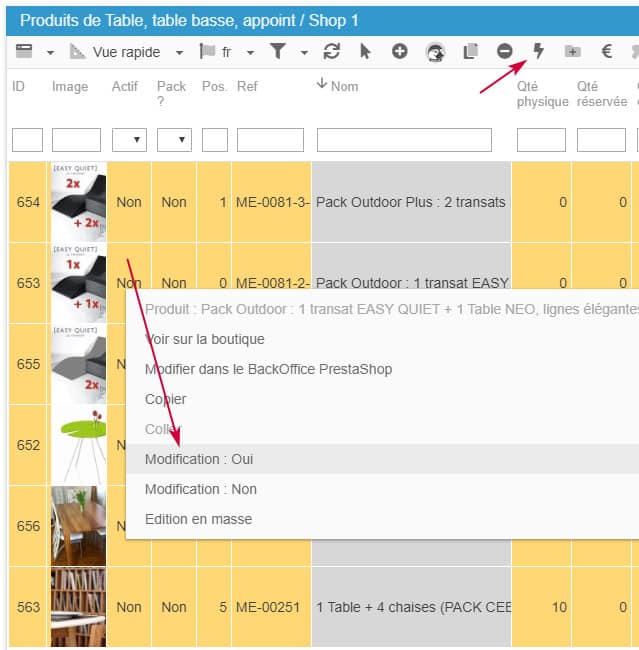Pour tous les champs qui utilisent les valeurs oui/non comme actif, en soldes, afficher le prix, etc, qui permet une modification en masse ultra rapide !