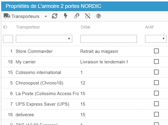 Dans cette grille, vous pouvez décider quels seront les transporteurs disponibles pour vos produits et le faire en masse.