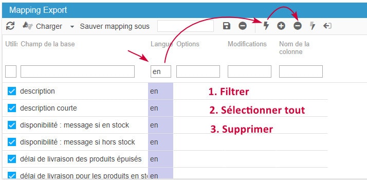 Saisissez 'EN' dans la boite de filtre de la colonne 'Langue' pour afficher tous les champs correspondants. Puis cliquez sur l'icône de sélection en masse et enfin sur l'icône de suppression de lignes. Répétez l'opération pour toutes les autres langues présentes pour n'obtenir que les champs FR.