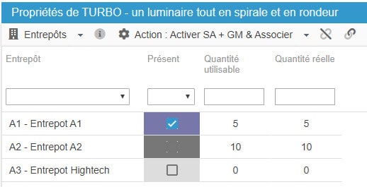 Gris foncé : certains produits sélectionnés sont associés et sont présents dans Entrepôt A2