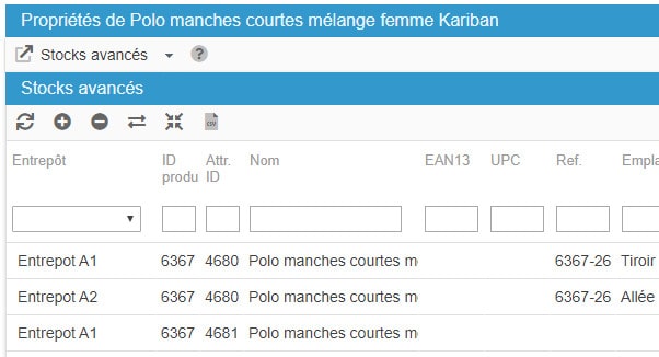 La grille des Stocks Avancés de Store Commander vous permet de filtrer par entrepôt pour que vous puissiez avoir une vue globale du stock de tous les produits de la boutique pour un entrepôt spécifique.