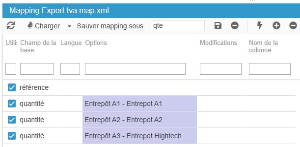 Lors de la création de votre script d'export, le mapping correspondant utilisera le champ de base de données 'quantité'. Ce champ inclut une option supplémentaire qui vous permet de choisir l'entrepôt dans lequel se trouve le stock :