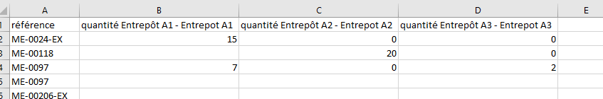 Le fichier CSV obtenu affichera les quantités du produit disponible dans chaque entrepôt sélectionné dans votre mapping :