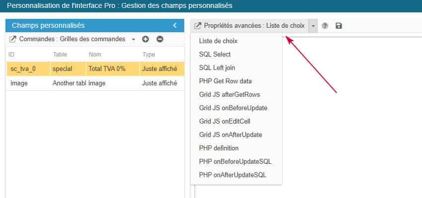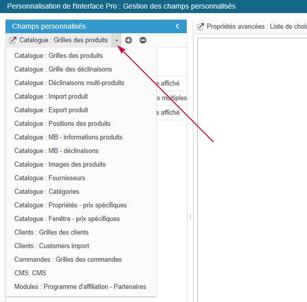 • Pour accéder à la partie PRO, cliquez sur l'icône  de la colonne de droite intitulée 'Champs Disponibles' :