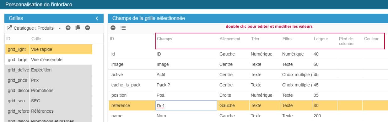 Le module Personnalisation de l'interface vous permet non seulement de créer et/ou de modifier les vues de Store Commander mais aussi de personnaliser encore davantage les colonnes de l'interface comme par exemple :