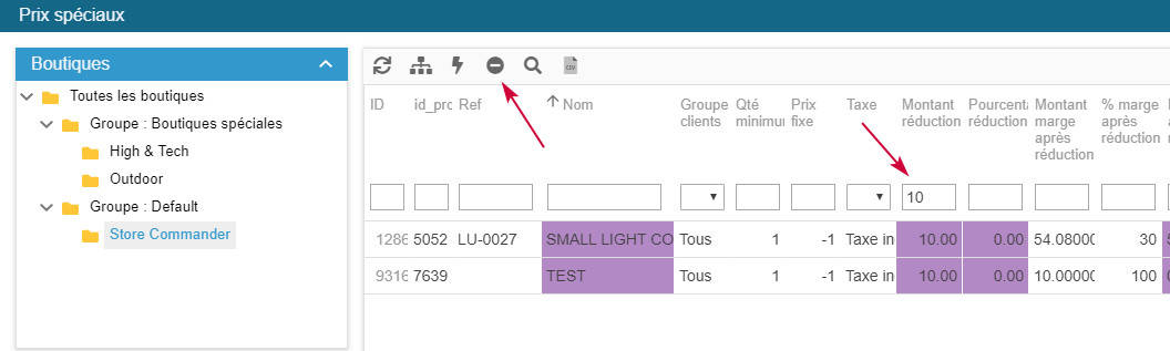 Utilisez les outils de filtres au préalable (si nécessaire) pour ensuite sélectionner tous les prix spéciaux correspondant avec l'icône de sélection en masse