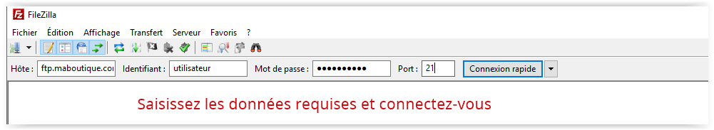 Dans la barre de connexion, saisissez l'adresse FTP de votre boutique, le nom d'utilisateur et le mot de passe pour vous connecter à votre site