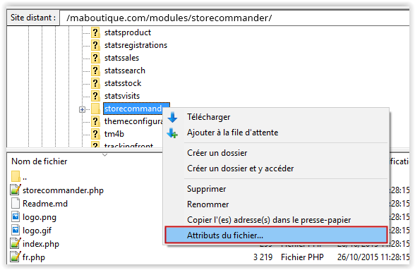 Faites un clic droit sur le dossier /storecommander/ pour afficher le menu contextuel et sélectionnez 'Attributs du fichier' (ou Droits d'accès au fichier')