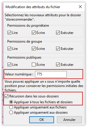 Une fois que vous avez validé les modifications ci-dessus, les permissions seront appliquées à chaque dossier et chaque fichier contenu dans le répertoire /storecommander/.